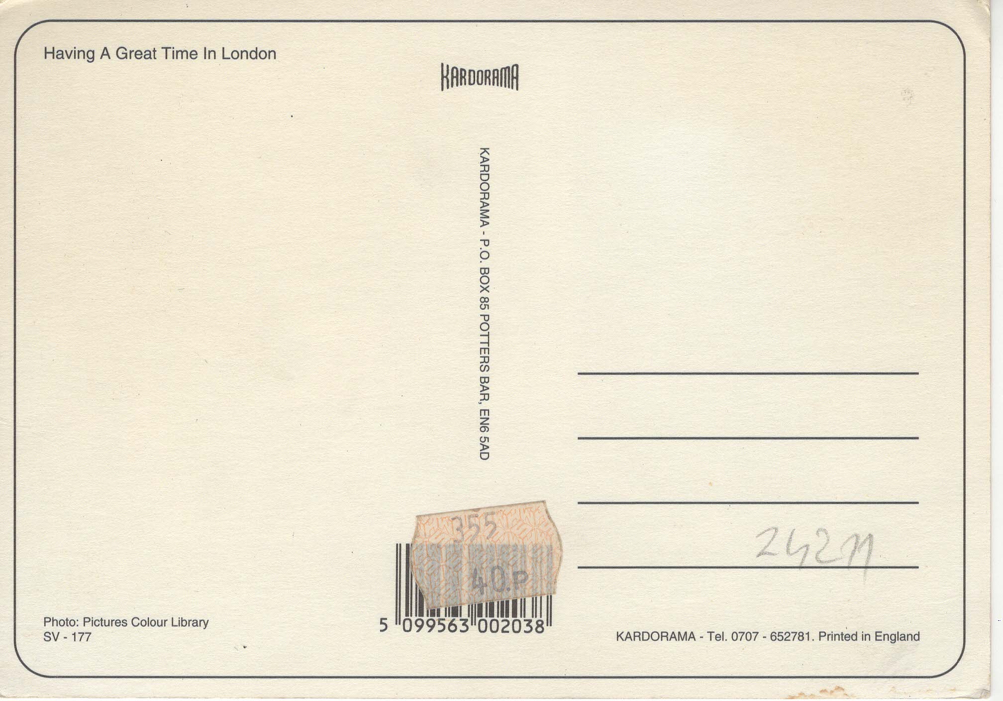 - Popis: Poměrně zachovalá, s nalepenou cenovkou 40p. Vydána před rokem 2004, kdy zavřeli Raymond Revuebar. Foceno cca z místa 52 Rupert street. Na přední straně je text "Having a great time in London".