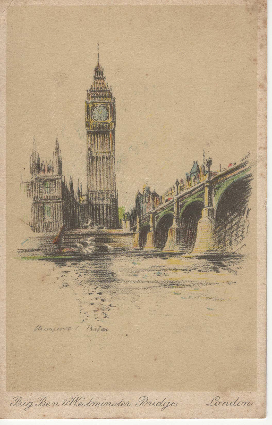 Krásná pohlednice s malovaným pohledem na Big Ben přes řeku Temži, natištěna na velmi pevném papíře. Velmi dobře zachovalá. až na drobné skrvnky. Na přední straně text "Big Ben & Westminster Bridge, London".