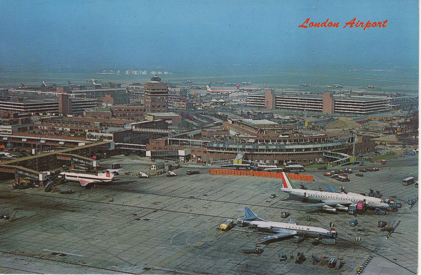 Popis: Na pohlednici je letadlo de Havilland Comet 4 – používaný v letech cca 1958–1965. Na snímku je vidět centrální terminálová oblast s charakteristickou řídicí věží a okolními budovami z 50.–60. let. Tahle pohlednice je velmi pěkný zástupce rané jet age a expanze Heathrow.