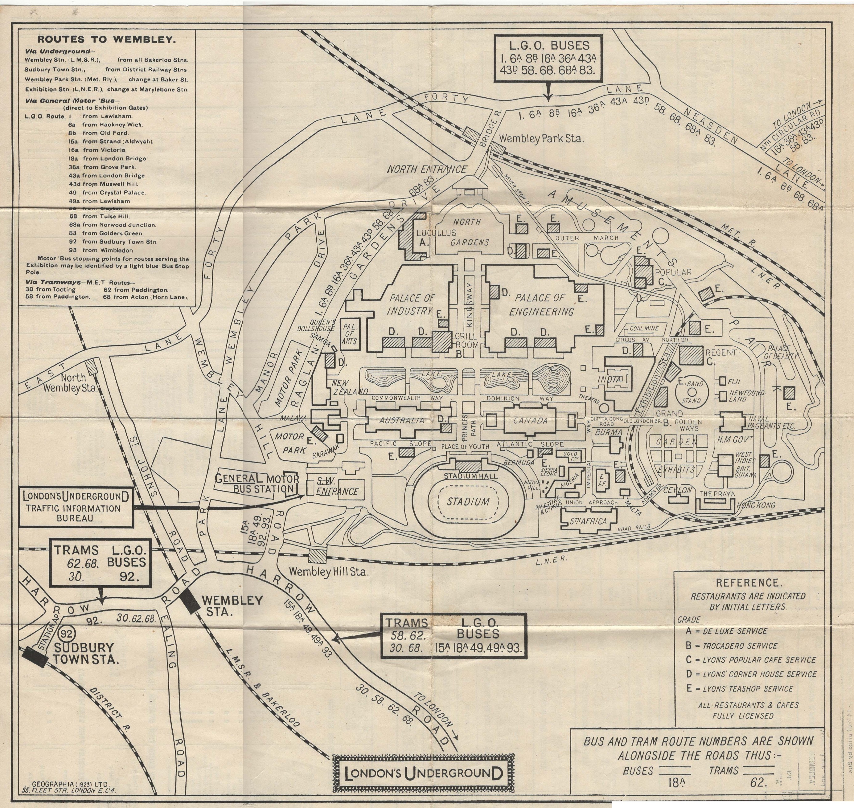 - Popis: Mapa areálu British Empire Exhibition + informace o dopravě, odjezdech a cenách jízdného