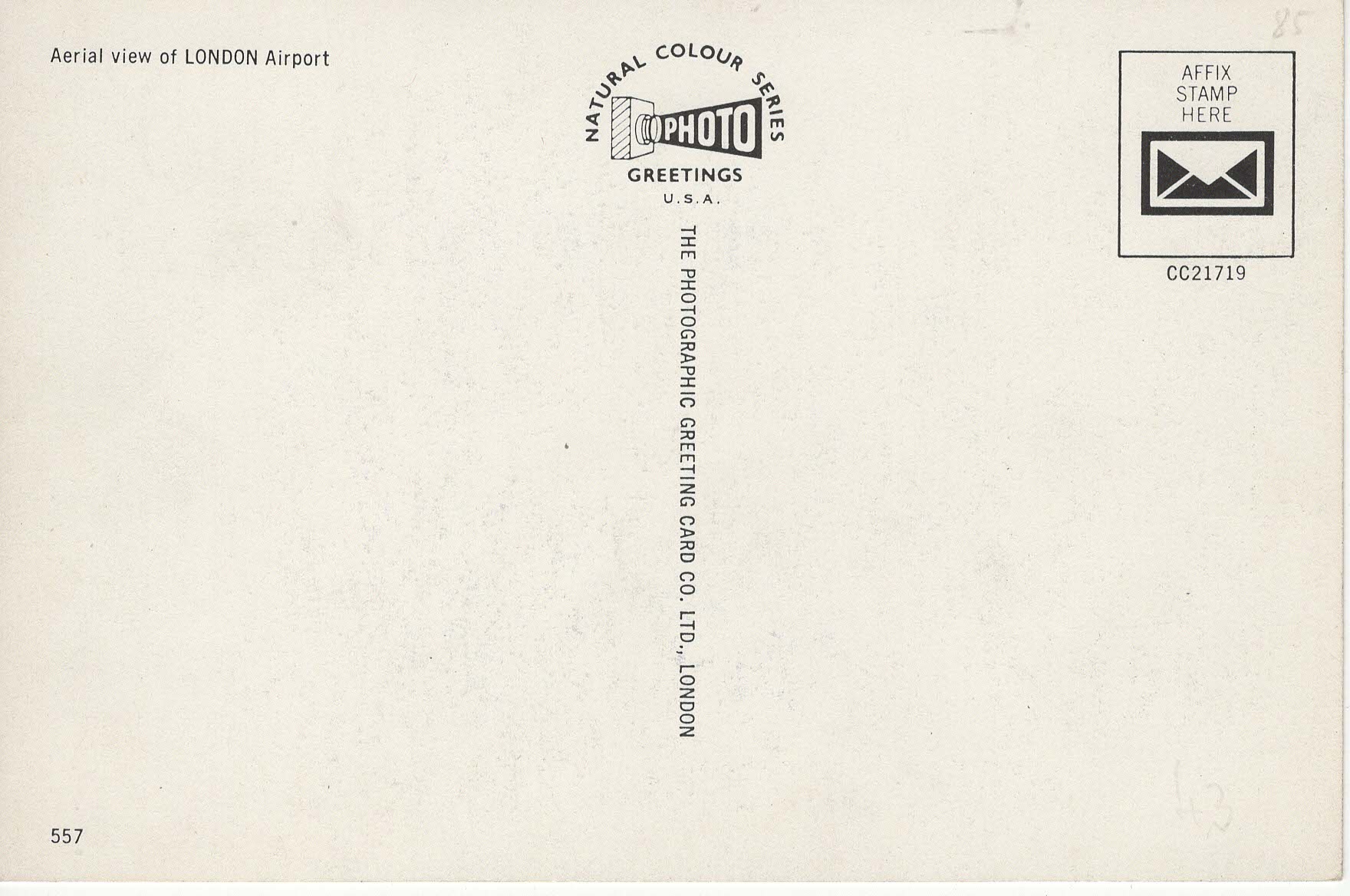 Popis: Na pohlednici je letadlo de Havilland Comet 4 – používaný v letech cca 1958–1965. Na snímku je vidět centrální terminálová oblast s charakteristickou řídicí věží a okolními budovami z 50.–60. let. Tahle pohlednice je velmi pěkný zástupce rané jet age a expanze Heathrow.